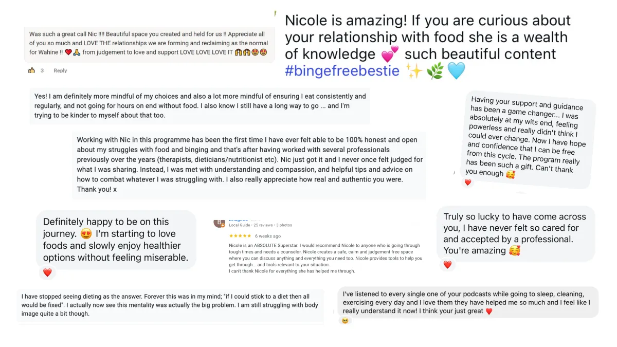 I'm a registered therapist, recovered binge eater, and founder of Binge Free Bestie. I live in Aotearoa, New Zealand and support women all around the globe!